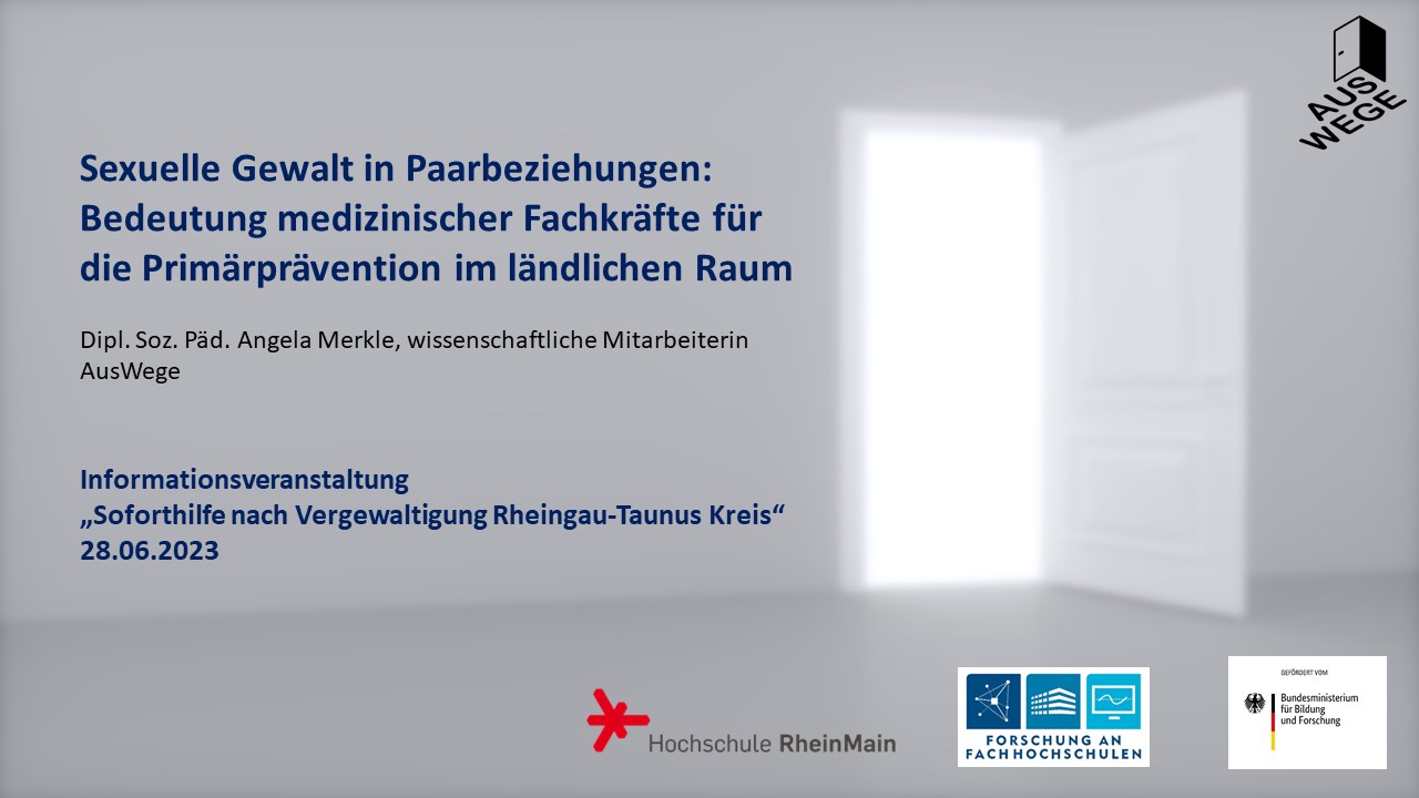 Organisiert von der Gleichstellungsbeauftragten, Binia Ehrenhart-Rosenberger, und dem Kreisgesundheitsamt wurde die Veranstaltung im Saal des Bürgerhauses Taunusstein, die zum Projekt „Medizinische Soforthilfe im Rheingau-Taunus-Kreis“ informierte, von Gesundheitskoordinatorin des Kreises, Beate Sohl moderiert. Neben dem Vortrag der wissenschaftlichen Mitarbeiterin von AusWege, Angela Merkle, über „sexuelle Gewalt in der Paarbeziehung und die Bedeutung medizinischer Fachkräfte für die Primärprävention im ländlichen Raum“ stellten die kooperierende Fachberatungsstelle bei sexualisierter Gewalt, Wildwasser Wiesbaden e.V., die Beratungs- und Informationsstelle gegen Häusliche Gewalt sowie „Haus für Frauen in Not“, Caritas Wiesbaden-Rheingau-Taunus e.V. und die Familiensprechstunde der „Frühen Hilfen“ den rund 40 Teilnehmenden ihre Arbeit vor.