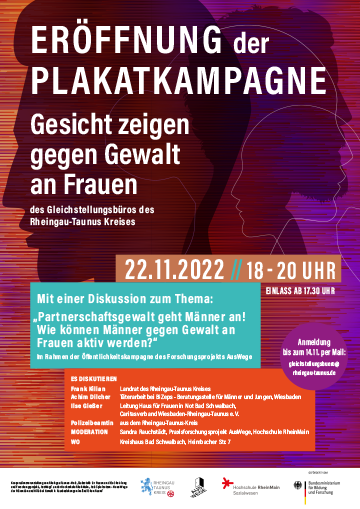 In Verbindung mit der Eröffnung der auf fünf Jahre angelegte Plakatkampagne der Gleichstellungsbeauftragten des Rheingau-Taunus-Kreises „Gesicht zeigen gegen Gewalt an Frauen“ galt es in einer moderierten Podiumsdiskussion im Kreishaus Bad Schwalbach aufzuzeigen, wie etwa Freunde, Angehörige, Nachbarn oder Kollegen aktiv werden und Betroffene unterstützen können. Bewusst gemacht werden sollte, dass Partnerschaftsgewalt keine Privatsache ist, die Betroffenen auf ein aktives und unterstützendes Gemeinwesen sowie das Engagement von Frauen und Männern gegen Partnerschaftsgewalt angewiesen sind und auch für das Umfeld von Betroffenen professionelle Angebote der Information und Unterstützung bestehen, um handlungsfähig zu werden und dazu beizutragen, diese Gewalt zu stoppen.