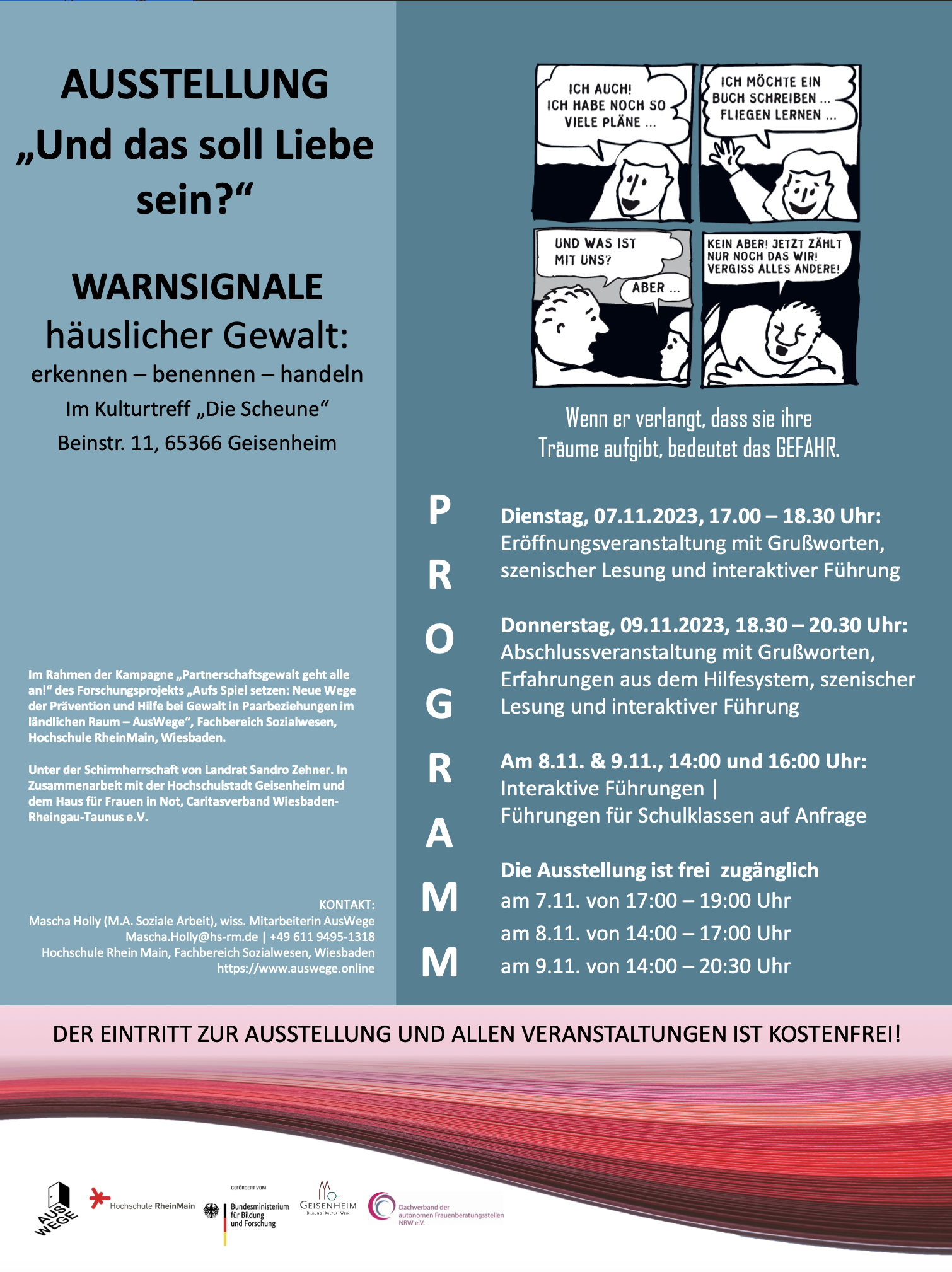 Die Ausstellung „Und das soll Liebe sein?“ will für Warnsignale, die auf eine (entstehende) Gewaltdynamik hindeuten, sensibilisieren, und zwar sowohl Betroffene als auch deren Umfeld. Entwickelt wurde die Ausstellung vom Dachverband der autonomen Frauenberatungsstellen NRW e.V.© auf Grundlage der gleichnamigen Bildgeschichte von Rosalind B. Penfold©, die selbst eine mehrjährige Gewaltbeziehung er- und überlebt hat. Auf den Roll Ups der Ausstellung wird eindrucksvoll deutlich, auf welche zum Teil subtile Weise sich erste Warnsignale eines beginnenden Kreislaufs von psychischer, physischer, sexueller und sozialer Gewalt zeigen können.