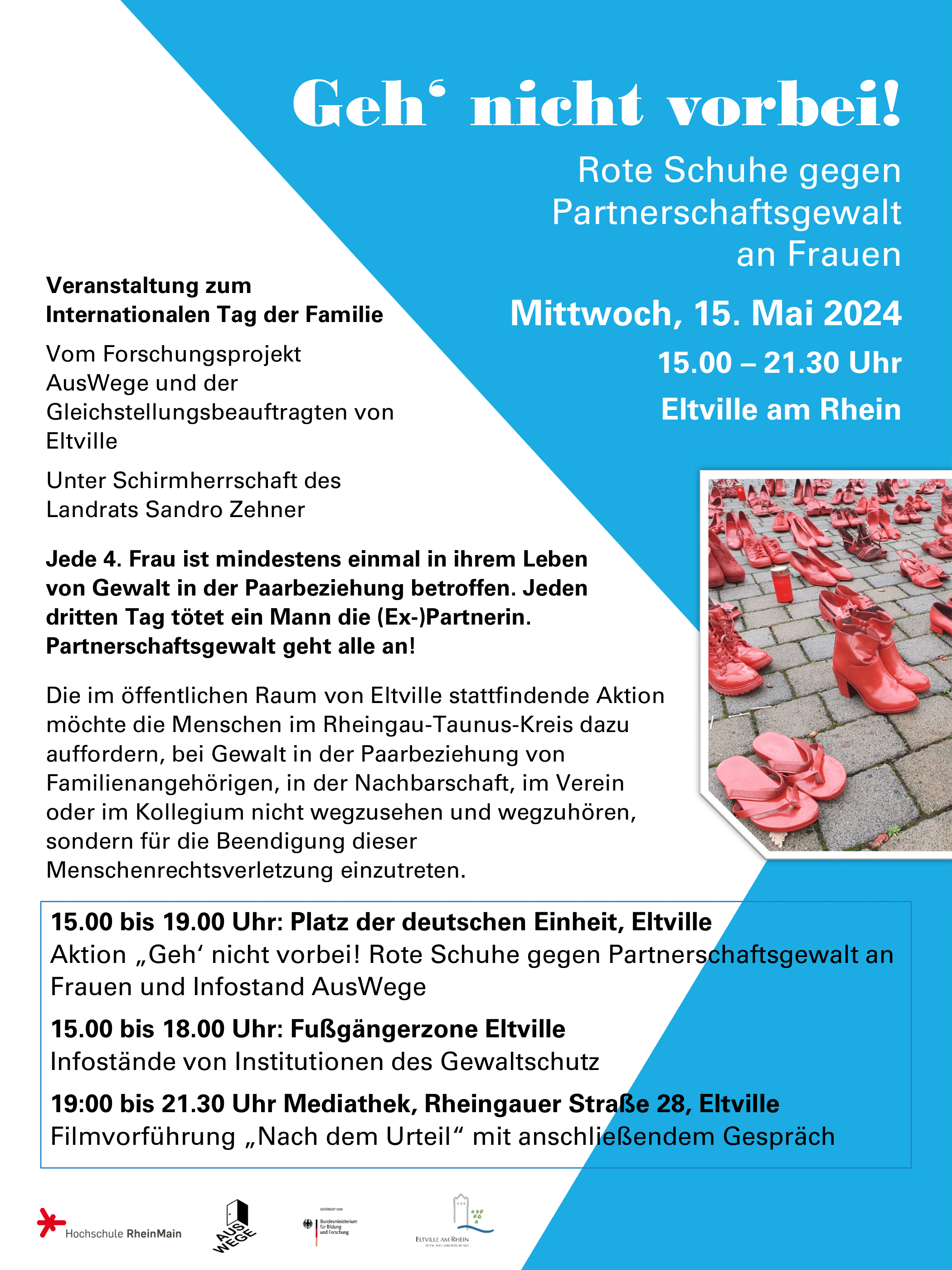 | 15.05.2024, 15:00 - 18:00 Uhr | Kunstaktion „Geh‘ nicht vorbei! Rote Schuhe gegen Partnerschaftsgewalt an Frauen“ sowie Infostände und ein interaktiver Sprayspace, in Eltville |